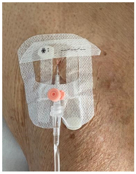 We present the case of an 88-year-old patient who was admitted to the Infectious Disease clinic at University Hospital in Udine due to the incidental detection of a positive SARS-CoV-2 nasal-pharyngeal swab result during hospitalization for head injury and a stable C2 fracture without surgical indication. At day 30 of hospitalization, the patient exhibited a decrease in oxygen saturation and went through an episode of fever (38.7 °C). Vital signs were stable, and the laboratory results reflected a C-reactive protein (CRP) elevation (82 mg/L). In the context of this clinical deterioration, a chest radiograph was performed, revealing a widespread and bilateral accentuation, blurring of the vasculo-interstitial pattern, and subtle parenchymal consolidations in the upper and lower right perihilar regions. Due to suspected hospital-acquired pneumonia, an empiric antibiotic therapy with piperacillin/tazobactam continuous infusion (4.5 g loading dose and then 18 g maintenance dose in 24 h continuous infusion) was started. The blood cultures collected before the start of antibiotic therapy were negative. After 2 days, we decided to switch the administration route of piperacillin/tazobactam from i.v. to s.c. due to the unavailability of suitable veins for injection. After the insertion of Venflon 20 Gauge catheter for s.c. infusion in the thigh (Figure 1), we initiated s.c. infusion of 4.5 g of piperacillin/tazobactam in 50 mL saline solution through a normal i.v. line without an elastomeric or an infusion pump. Every 6 h, we temporarily discontinued the infusion, massaged the injection site, and then reattached the infusion, changing its location to the other thigh every 24 h. Through this administration schedule, we aimed to simulate a continuous infusion at a rate of 8.4 mL/h. During the following days, therapeutic drug monitoring (TDM) was conducted, revealing a blood concentration of piperacillin of 52.39 mg/L after 4 days and 93.73 mg/L after 8 days following the switch from i.v. to s.c infusion. The patient went through a clinical improvement and a reduction in the inflammation markers (10 days after the start of the therapy, the CRP was 9.45 mg/L). For this reason, the treatment was discontinued after a duration of 10 days. The piperacillin blood concentration measured at the end of antibiotic therapy was 156.39 mg/L.