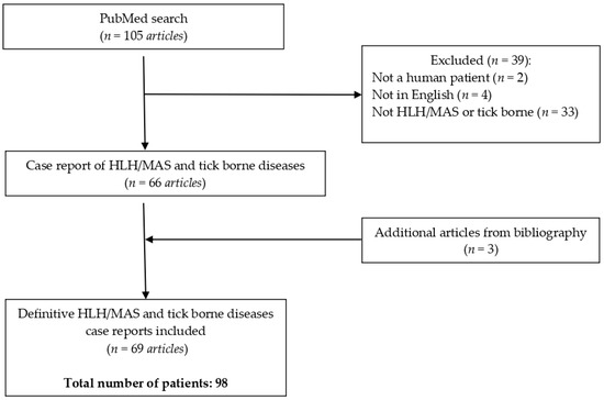 Two authors blindly and independently selected the cases (D.J. and S.O.). A senior author (I.D.) made a definitive choice when the two authors did not reach a consensus. All included cases met the criteria of having confirmed tick-borne disease and a high likelihood of HLH, as evidenced by the H-score and/or bone marrow (BM) analysis. The following were excluded from the analysis: articles published in languages other than English; case reports not providing an appropriate amount of information, or where the diagnosis was not certain; and those reporting non-human subjects. The final number of articles included was 69, which resulted in a total number of 98 patients (Figure 1) [15,16,17,18,19,20,21,22,23,24,25,26,27,28,29,30,31,32,33,34,35,36,37,38,39,40,41,42,43,44,45,46,47,48,49,50,51,52,53,54,55,56,57,58,59,60,61,62,63,64,65,66,67,68,69,70,71,72,73,74,75,76,77,78,79,80,81,82,83].