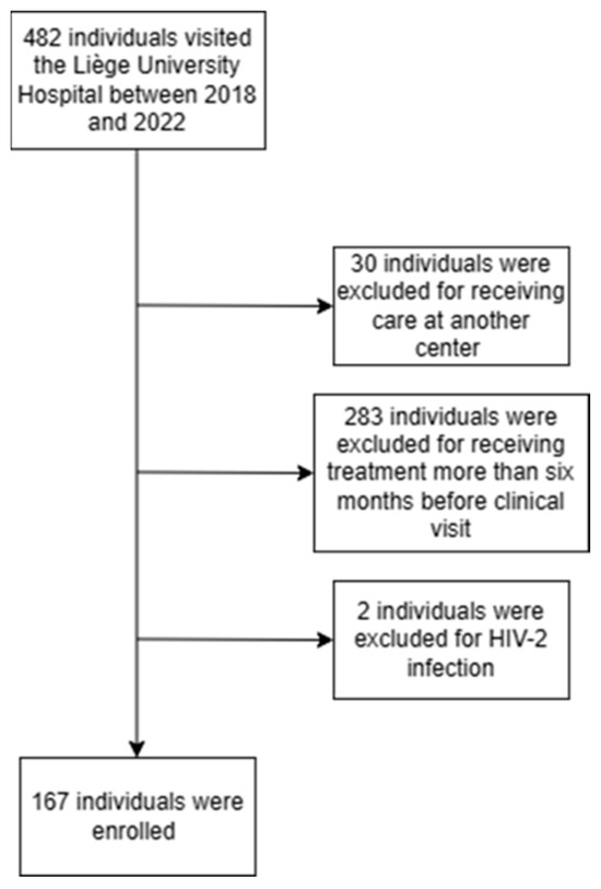 In this retrospective cohort study, we included HIV-1-infected individuals aged at least 16 years who presented for clinical care at Liège University Hospital (Belgium) for the first time between 1 January 2018 and 31 July 2022. Patients who had already received care for HIV infection at another clinical centre as well as patients who were treated for more than six months before the first clinic visit were excluded from the study.