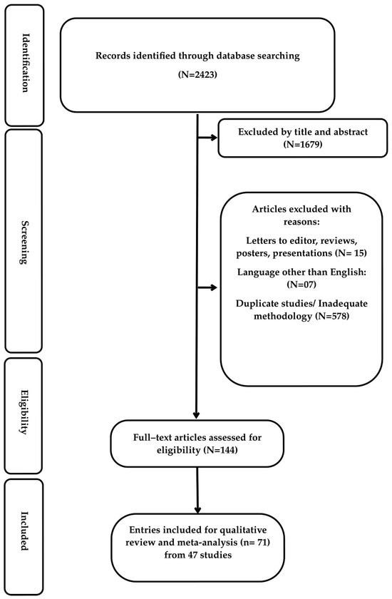 There were 2423 studies identified from the initial search. After evaluation of the titles and abstracts, we excluded 1679 studies and reviewed the full texts of the remaining 144 studies. Fifteen studies were excluded based on the review of the full text. After reviewing the 129 remaining studies and their bibliographies, 71 entries were included in this systematic review (Figure 1). Entries refer to in vitro and in vivo observations; one study (publication) could have two entries corresponding to in vitro and in vivo results.