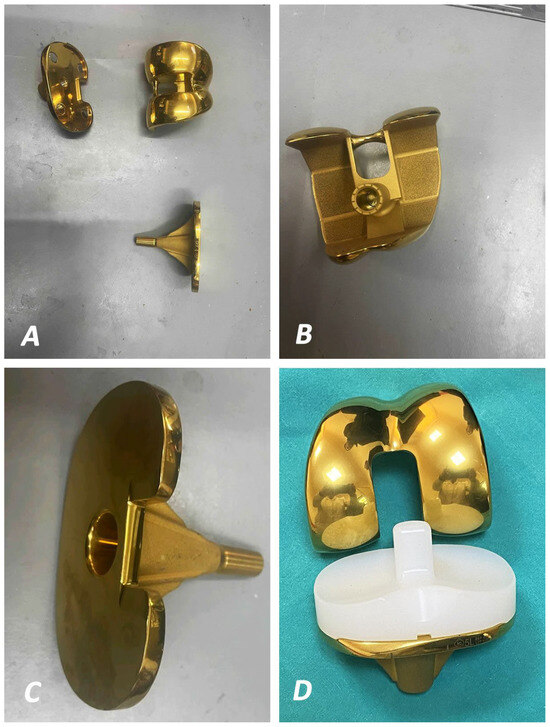 Titanium nitride (TiN)-coated implants for total knee arthroplasty (A) composed of the femoral (B), tibial (C) components, and the polyethylene insert (D) displaying significant anti-infective activity and excellent biocompatibility linked to controlled ion release and long-term chemical stability.