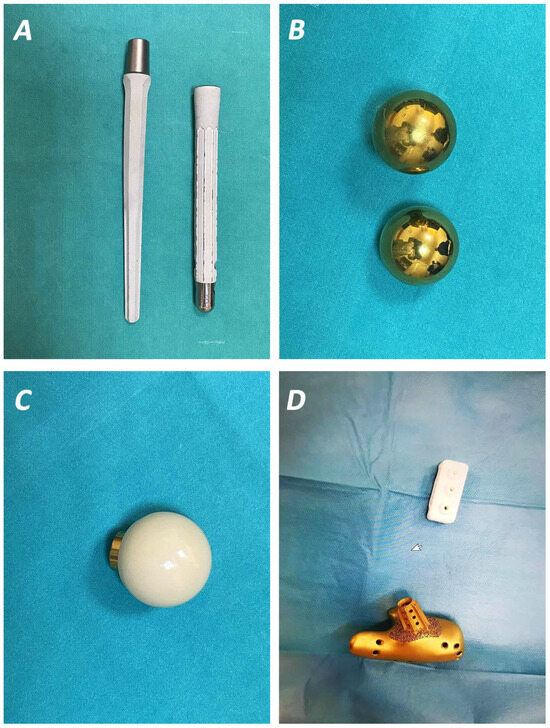 Silver-coated femoral stem (A), titanium nitride (TiN) (B), and vitamin E-coated (C) femoral heads applied in patients after a two-stage revision for infected total hip replacement. (D) custom-made titanium nitride (TiN)-coated implant fabricated with 3D printing technique for the replacement of the calcaneus after complex osteomyelitis.