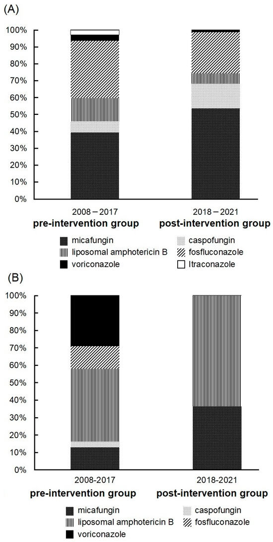 (A) Initial antifungal drugs received by patients. The pre-intervention group (2008–2017) and the post-intervention group (2018–2021) included 120 and 84 patients, respectively. (B) The drug of choice in cases where the drug was changed due to inadequate efficacy. Drug changes due to diagnosis of endophthalmitis, sensitivity, identification of bacteria, and drug changes due to mild disease were excluded. The pre-intervention group (2008–2017) and the post-intervention group (2018–2021) included 31 and 11 patients, respectively.