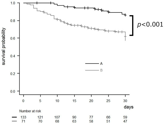 Count data were expressed as percentages, and univariate analysis was conducted using Fisher’s exact test. Unpaired Student’s t-tests were used to analyze normally distributed measurement data. The Wilcoxon rank-sum test was used to analyze nonnormally distributed measurement data. A logistic regression analysis was performed to analyze the relationship between compliance with the action bundle and the 30-day mortality rate. The log-rank test was used to compare the two survival curves. All statistical analyses were performed using the EZR software program version 1.55 (Saitama, Japan). p values of <0.05 were considered statistically significant.