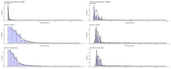 The final estimates for partnership durations were between 1065 and 1409 days for steady, and 4–6, 251–299 and 8–13 days for assortative HA-, LA- and mixed persistent casual partnerships, respectively, varying across the three definitions for the activity group (Table 2). The estimated homophily rates for all three relationship types were high for steady and one-off partnership, for both activity groups, but lower for persistent casual partnerships (Table 2). The distributions of the observed and simulated cumulative number of partners in a period of 12 months is shown below as a histogram for the EMIS-reported partners and as a density plot for the simulated ones (Figure 1, Figure 2 and Figure 3).