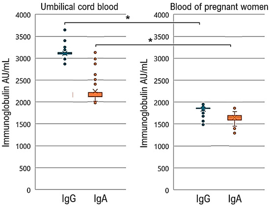 Comparison of the levels of anti-spike glycoprotein of SARS-CoV-2 immunoglobulin A (IgA) and immunoglobulin G (IgG) antibodies in maternal blood and umbilical cord blood during childbirth. The anti-SARS-CoV-2 IgA and IgG titers in umbilical cord blood were significantly higher than those in maternal blood. * p < 0.05.
