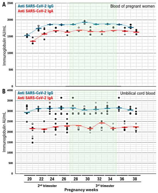 Human serum samples collected from maternal blood and umbilical cord blood were used for the detection of SARS-CoV-2 antibodies, specifically IgA and IgG, employing ELISA kits. For IgA analysis, the samples were initially diluted at a ratio of 1:25 in the appropriate sample dilution buffers. Subsequently, they were assessed using a semi-quantitative analysis ELISA kit following the manufacturer’s instructions (EUROIMMUN AG, Luebeck, Germany). In this assay, the microplate wells were coated with recombinant spike structural protein derived from the omicron-type SARS-CoV-2 XBB.1.5 subvariant. The results were interpreted by calculating a ratio of the extinction of samples over the extinction of the internal calibrator, with a ratio greater than 0.8 being considered positive. For IgG analysis, we used the Roche Elecsys Anti-SARS-CoV-2 S quantitative serology assay on the Roche Cobas e801 Analyzer according to the manufacturer’s instructions (La Roche Ltd., Basel, Switzerland). A result exceeding 0.8 units/mL, based on internal calibration curves, was considered positive (Methods in Supplementary Materials).