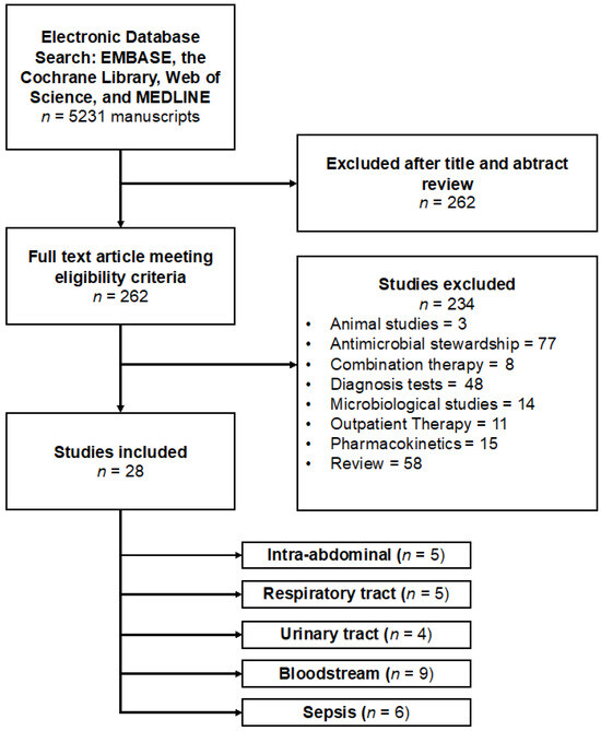 The twenty-eight included studies contained a total of 46,885 participants, with a median of 345 participants per study, a minimum of 28 participants, and a maximum of 35,529 participants. Among the sites of infection, the most studied were bloodstream infections (n = 9), followed by respiratory tract infections (n = 5), intra-abdominal infections (n = 5), and urinary tract infections, evaluated by 3 studies. Studies that exclusively included patients with sepsis and septic shock were evaluated separately due to severity, although primary sites of sepsis were not included in studies that evaluated site-specific infection (Figure 3).
