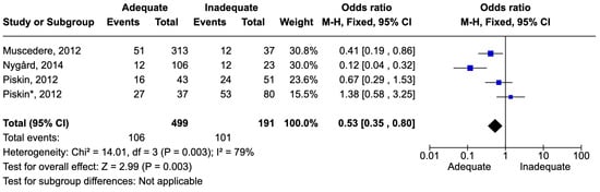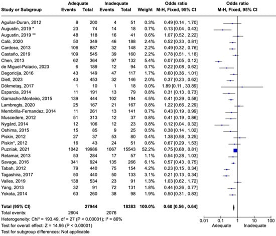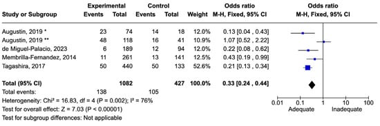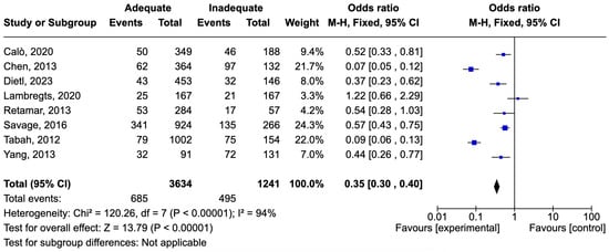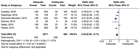 Figure 8. Forest plot of studies included in the meta-analysis to evaluate adequate antimicrobial therapy and mortality in sepsis [53,64,66,67,71,72].