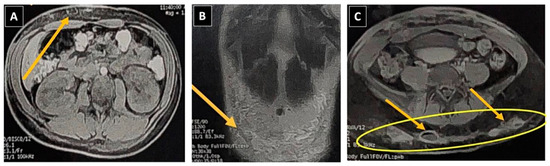 Magnetic Resonance Imaging (MRI) of the pelvic region. (A,B) Large collection in the hypogastrium measuring 12.3 × 2.0 cm, indicated by yellow arrows. (C) Abscesses in the gluteal regions, sizing at 3.5 × 2.0 cm on the right side and 4.2 × 2.4 cm on the left side, accompanied by a slight presence of free fluid within the pelvic cavity.