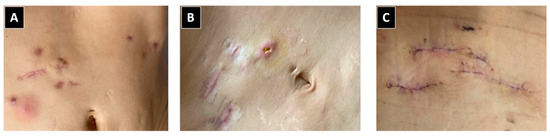 Following the identification and sensitivity test results, Clofazimine at 100 mg/day and intravenous Amikacin at 500 mg/day for 15 days, followed by three times a week for the initial 3 months, were added to the treatment regimen of Clarithromycin at 500 mg every 12 h and Moxifloxacin at 400 mg once daily. Since then, there has been an improvement in the nodules (Figure 1). She is currently receiving treatment in Rio de Janeiro, with a treatment regimen based on Clarithromycin, Moxifloxacin, and Clofazimine. It is expected that her treatment will be completed by April 2024. The patient has opted not to undergone surgical removal of the nodules or abscesses.