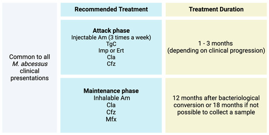Recommended treatment for Mycobacterium abscessus. Subspcies: M. abscessus abscessus, M. abscessus massiliense, and M. abscessus bolletii. Modified from (4).