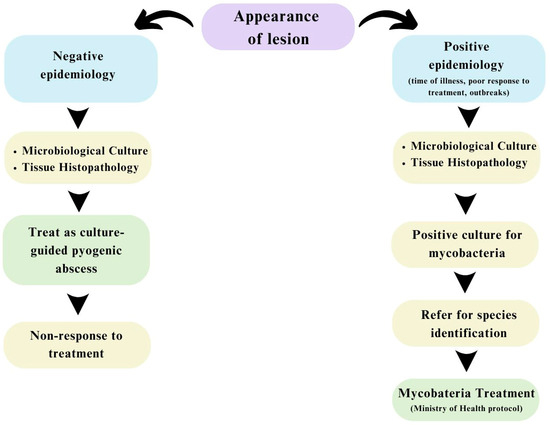 Currently, the literature is lacking a comprehensive and explicit guideline for managing healing control in extrapulmonary mycobacterial infections. The Brazilian Ministry of Health exclusively focuses on monitoring pulmonary infections, utilizing X-rays, bacilloscopy, and serial assessments, omitting guidance on monitoring and healing control for conditions beyond the lungs. In all three cases, monitoring involved observing clinical signs and detecting nodules by using ultrasound. Yet, it is crucial to highlight the absence of a specific monitoring protocol for mycobacterial infections outside the pulmonary context. Given the diagnostic challenges and the complexity of the investigation, as well as the absence of specific protocols for non-pulmonary infections caused by non-tuberculous Mycobacteria, the local hospital and infectious disease physicians have been utilizing the following flowchart to assist in the investigation (Figure 5).