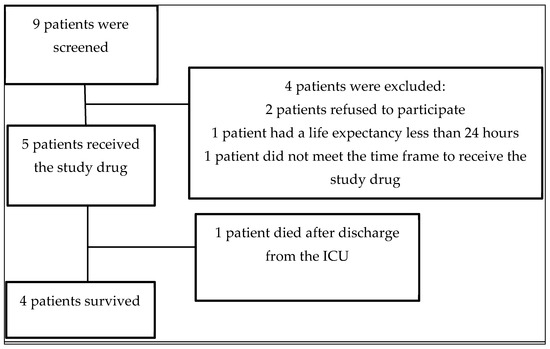 Two patients were excluded due to the refusal of the patient’s family, one due to a life expectancy of less than 24 h, and one because she did not meet the time frame for the administration of the drug (