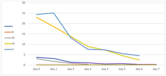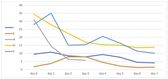Table 1. The patients’ mean age was 56.2 (SD 10.7). The patients’ respiratory involvement was variable in severity. The fifth patient required a tracheostomy due to his medical condition at the time of admission. Since the study drug was administered subcutaneously (SC), we recruited patients with sepsis or septic shock who required mild to moderate doses of noradrenaline. We wanted to limit the possibility of impaired drug absorption from SC tissue due to severe vasoconstriction due to severe septic shock. The noradrenaline doses ranged between 10 mcg/min and 50 mcg/min.