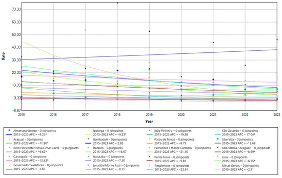 Analyzing the annual increase (APC) in the overall detection rate over the entire period (2015 to 2023), seven of these micro-regions showed a significant downward trend (p < 0.05): Almenara/Jacinto (APC = −9.25; 95%CI −16.61–−1.10), Araçuaí (APC = −11.79; 95%CI −17.85–−5.22), Belo Horizonte/Nova Lima/Caeté (APC = −9.61; 95%CI −14.65–−4.16), Carangola (APC = −12.83; 95%CI −23.67–−0.26), Ipatinga (APC = −9.32; 95%CI −14.74–−3.43), Uberlândia/Araguari (APC = −8.98; 95%CI −17.02–0.00) and Unaí (APC = −6.95; 95%CI −12.03–−1.42).