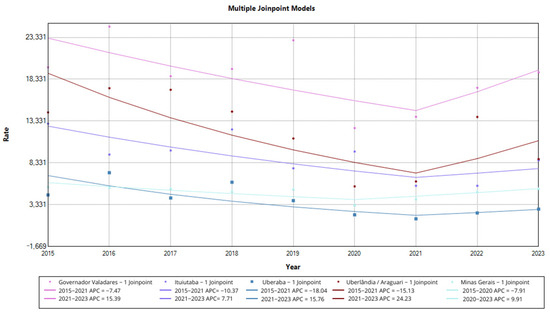 When evaluating the inflection points observed over the period, we identified a trend towards recovery. The state of Minas Gerais showed a significant negative annual increase between 2015 and 2020 (APC = −7.91; 95%CI −21.76–−1.72), and in 2020 it showed an inflection point, with an annual increase of 9.91 in the period from 2020 to 2023.