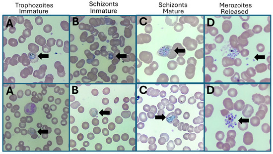 P. vivax life cycle (immature trophozoites, immature schizonts, mature schizonts, and free merozoites) were detected. For this purpose, the best images with parasites isolated from erythrocytes were chosen to observe the different stages.