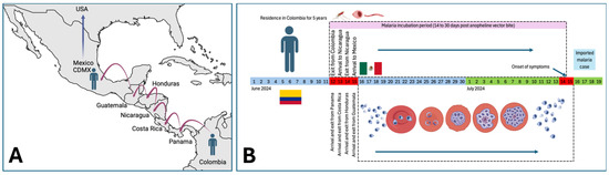 Table 1, the migrant’s departure from Colombia was on 12 June 2024, the date considered as the starting point for the epidemiological analysis in the timeline to determine the country where he could have acquired the parasite infection. Given that the migrant traveled through the five countries in four days (on average one day per country) and considering that the incubation period for malaria can be from 14 to 30 days along with the appearance of signs and symptoms and under the background of exposure to mosquito bites during his stay in Panama on 12 June, we speculate that the infection was acquired in that country.