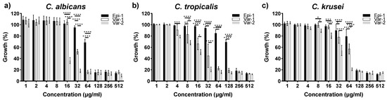 Susceptibility of the peptides against (a) C. albicans (MTCC 227), (b) C. tropicalis (CA4) and (c) C. krusei (CA54). Epi-1, var-1, and var-2 inhibited growth of C. albicans (MTCC 227) at 128 μg mL−1, 64 μg mL−1 and 32 μg mL−1. For C. tropicalis; epi-1, Var-1 and Var-2 showed MIC of 256 μg mL−1, 64 μg mL−1, and 32 μg mL−1, respectively. For C. krusei; epi-1 and Var-1 showed MIC of 128 μg mL−1 and variant-2 showed MIC of 64 μg mL−1. Cell density was measured at 595 nm after 24 h. Growth of the cells measured without peptides is used as a control with 100% growth. The level of significance was measured for variants compared to epi-1 at their respective concentrations tested. Statistical value representations are * p < 0.5, ** p < 0.1, *** p < 0.01, and **** p < 0.001.