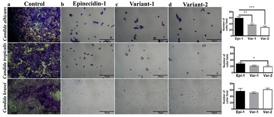 Light microscopic image of crystal violet stained C. albicans (MTCC 227), C. tropicalis (CA4), and C. Krusei (CA54) are shown in individual rows at 40× magnification. The columns represent (a) control, (b) epinecidin-1, (c) variant-1, (d) variant-2. The quantitative plots for each row is provided in the right column, The cells were treated with peptides at their respective MIC and incubated for 24 h. The image panel shows the effects of peptides in reducing biofilm formation. On the right, there are bar graphs representing the quantitative analysis of the number of cells under each treatment condition for each species. The quantitative cell number of the control is provided in the text but is not displayed in the plot because of variation in the Y-axis scale. Peptide treatment has invariably decreased the Candida spp. Cell numbers compared to the control. Statistical significance representations are * p < 0.5, ** p < 0.1, and *** p < 0.01.