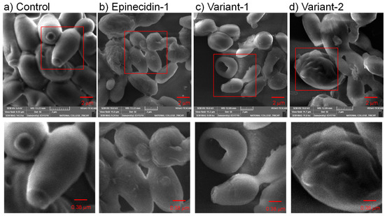 Scanning Electron Microscopy (SEM) was utilized to investigate the impacts of epi-1 and its variants on membrane penetration efficiency in the C. albicans cells as illustrated in Figure 3. Under SEM, the untreated control C. albicans cells exhibited typical features: oval shapes, smooth surfaces, polar buds, and bud scars. For examining the effects of the peptides on the C. albicans membrane, cells were incubated with 1 × MIC of the peptides for 6 h. The 6 h time point was chosen because a 24 h treatment typically detached all the cells from the cover slips. Since the peptide made pores on the membrane prolonged treatment with the peptides did not permit good sputtering of the heavy metal on the perforated cell surface.