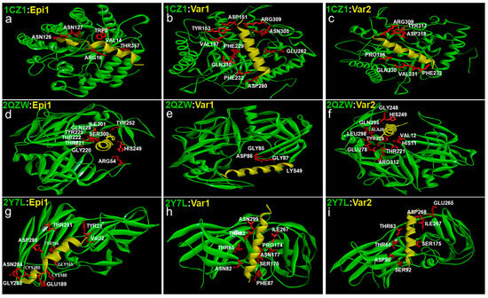 Docking interactions of epinecidin-1 and its variants with Candida Exo-B-(1,3)-Glucanase: PDB ID 1CZ1 (a–c), Secreted aspartic proteinase (Sap) 1: PDB ID 2QZW (d–f) and N-terminal domain of Als 9-2: PDB ID 2Y7L (g–i) biofilm forming membrane receptors. The Candida cell wall proteins are represented green in colour and the peptides are yellow in colour. The amino acids originating from the Candida cell wall proteins interacting with the peptides are represented in white with their three-letter code and their corresponding position. The amino acid side chain of the Candida protein (TYR, VAL, GLY, TYR, CYS, GLU, CYS, GLY, ASN, ASP, THR) acting as a binding pocket for the peptides is shown red in colour.