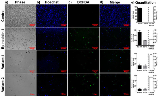 Effect of epinecidin-1 and its variants on the production of ROS by in C. albicans. Column (a) control cells, (b) epi-1, (c) var-1, and (d) var-2 peptide-treated cells and (e) Quantitation of number of cells in the field. Logarithmically growing C. albicans cells (1 × 105) were pre-incubated with 20 μM DCFHDA and grown for 24 h at 37 °C. Cells were treated with and without peptides. After 24 h, the culture dish was washed with phosphate-buffered saline pH 7.4 and observed under a fluorescent microscope. Hoechst staining was performed alongside to determine the number of live cells. The images were captured at an excitation wavelength of 488 nm and an emission wavelength of 525 nm. The bar graphs on the right show the quantitation of cells in blue and green channels. The bar on the extreme right shows the percentage of cells with ROS calculated from the number of cells in the blue and green channels. The control does not have ROS-positive cells. The variants have more than 90% ROS production.