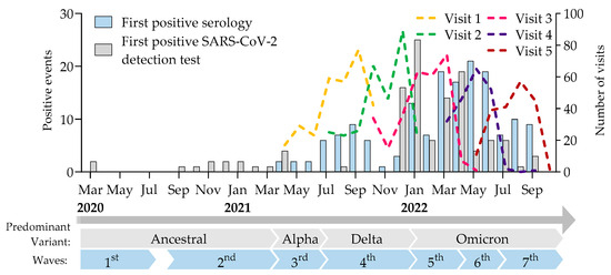 Timeline of the study illustrating the visits (coloured dashed lines) and the first occurrences of seropositivity (blue bars, combined detection of IgG antibodies against spike and nucleocapsid proteins) and of SARS-CoV-2 positive virus detection (grey bars, PCR or rapid antigen). Adapted from [13].