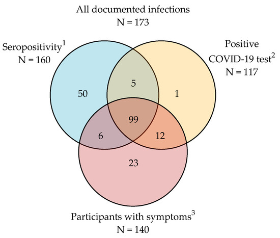 Documented infections and participants with symptoms. 1 Combined detection of IgG antibodies against spike and nucleocapsid proteins; 2 nasopharyngeal PCR or rapid antigen test; 3 at least one symptom related to COVID-19: cough, fever, shortness of breath, sore muscles, headache, sore throat, diarrhea, runny nose, or decreased sense of smell or taste.