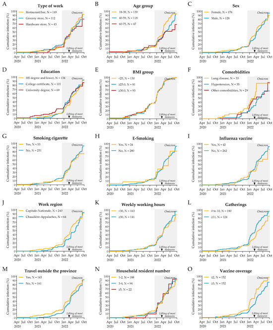 Kaplan–Meier curves depicting the cumulative event rate of all infections, stratified by type of work (A), age group (B), sex (C), education level (D), BMI group (E), comorbidities (F), smoking habits (G,H), influenza vaccine status (I), work region (J), weekly working hours (K), social gatherings frequency (L), travel frequency (M), household resident number (N), and number of COVID-19 vaccinations received (O). The shaded area indicates the Omicron period. The arrow indicates the lifting of most public health measures, which occurred on 12 March 2022.