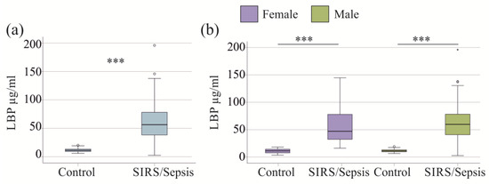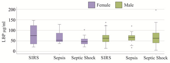 Patients were divided into three cohorts: SIRS, sepsis, and septic shock [34]. There was no significant difference in circulating LBP levels between these groups, whether considered as an entire cohort (p = 0.375), by men (p = 0.990), or women (p = 0.082) (Figure 3).