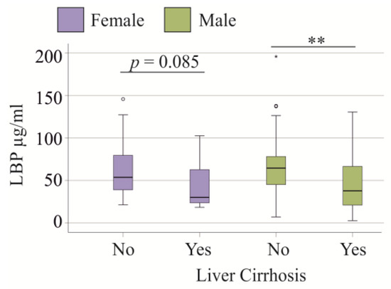 LBP is an acute-phase protein synthesized by hepatocytes and its circulating levels are increased in patients with liver cirrhosis compared to healthy controls [9,36]. However, in the SIRS/sepsis patient cohort, the 34 patients with liver cirrhosis had reduced plasma LBP levels (p = 0.001). The LBP of patients with cirrhosis was 32.4 (2.5–130.5) µg/mL and that of patients without cirrhosis was 52.2 (6.5–196.0) µg/mL. Among male patients, 26 had liver cirrhosis, and they also showed a decline in LBP levels in comparison to male patients with normal liver function (p = 0.002, Figure 2). The 8 females with liver cirrhosis had a trend for reduced LBP levels in comparison to female patients with normal liver function (p = 0.085) (Figure 2). Comparison of male with female patients without liver cirrhosis (p = 0.373) and male with female patients with liver cirrhosis (p = 0.687) revealed similar levels of plasma LBP (Figure 2).