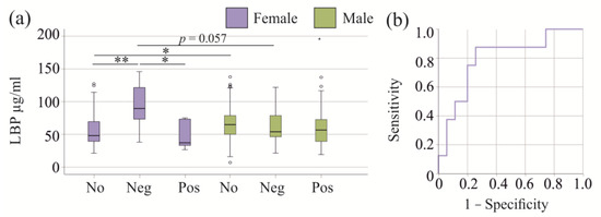 LBP in plasma of patients with SIRS/sepsis stratified for type of bacterial infection. (a) LBP in plasma of female and male patients with SIRS/sepsis stratified for type of bacterial infection; Statistical test used: Kruskal–Wallis test; (b) Receiver operating characteristic for discrimination of females with Gram-negative infections from those with no or Gram-positive infections by plasma LBP. * p < 0.05, ** p < 0.01.