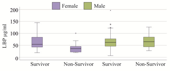 Our observation in the entire SIRS/sepsis cohort is consistent with the finding that systemic LBP measured early after admission to intensive care is not related to mortality [11,41,55,56]. Of clinical relevance, our sex-specific analyses revealed that female patients who did not survive had lower plasma LBP levels compared to both surviving females and compared to male patients who did not survive. We therefore suggest that this reduction of LBP in critically ill female patients is related to mortality. Immune cell counts, CRP and procalcitonin of male and female non-survivors were similar, and differences in inflammatory responses do not seem to explain this difference. It has been observed that lower LBP levels are associated with survival. This cohort consisted of 59% males and approximately 10% of the patients had hepatic dysfunction. However, a sex-specific analysis has not been conducted [57].