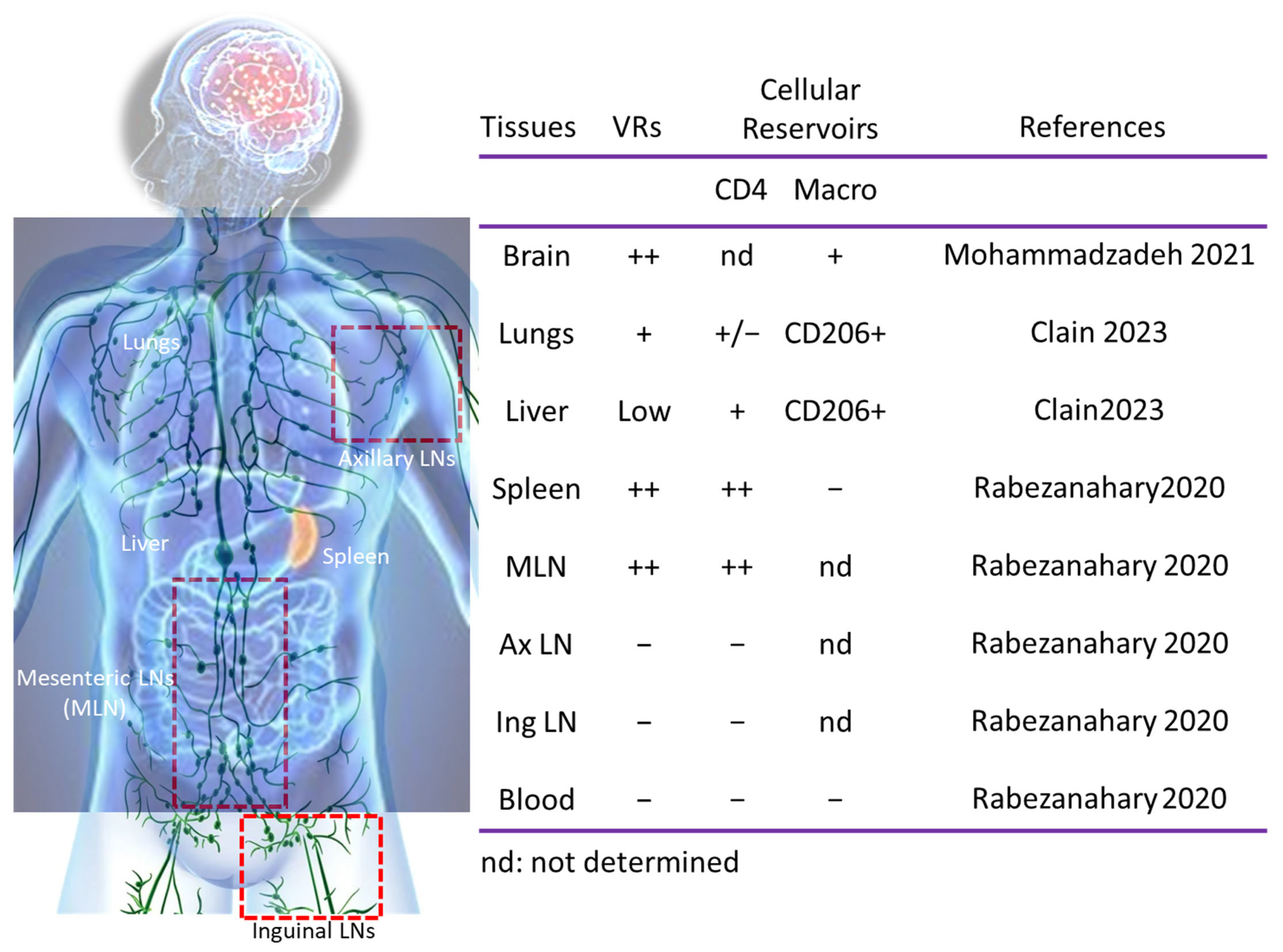- Rabezanahary, H.; Moukambi, F.; Palesch, D.; Clain, J.; Racine, G.; Andreani, G.; Benmadid-Laktout, G.; Zghidi-Abouzid, O.; Soundaramourty, C.; Tremblay, C.; et al. Despite early antiretroviral therapy effector memory and follicular helper CD4 T cells are major reservoirs in visceral lymphoid tissues of SIV-infected macaques. Mucosal Immunol. 2020, 13, 149–160. [Google Scholar] [CrossRef]