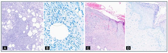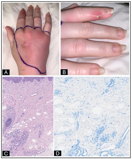 Her vital signs were blood pressure of 141/67 mmHg, heart rate of 94 bpm, respiratory rate of 18 rpm, and temperature of 37.1 °C. Her initial laboratory workup is summarized in Table 1. Her physical exam revealed an erythematous rash on the dorsum of the right hand with a 2 × 2 cm non-fluctuating nodule between the second and third metacarpals (Figure 1A) and erythema extending to the right index finger with a vesiculopustular lesion in the distal phalanx (Figure 1B). MRI of her right hand showed dorsal right-hand cellulitis with extensor digitorum tenosynovitis and no abscess or osteomyelitis. She was initially treated with intravenous (IV) vancomycin and piperacillin-tazobactam. A skin punch biopsy of the dorsum of the right hand showed mostly dermal fibrosis (Figure 1C) and no microorganisms (Figure 1D). A second biopsy of her right second finger was completed and sent for culture, which grew acid-fast organisms at day 12 of culture. Her antibiotic regimen was changed to clarithromycin 500 mg PO twice a day and ethambutol 800 mg PO daily to empirically cover for possible Mycobacterium marinum. Further culture data by MALDI-TOF MS revealed Mycobacterium chelonae. Her antibiotic regimen was switched to moxifloxacin 400 mg PO daily and clarithromycin 500 mg PO daily for 6–12 months, along with IV imipenem 500 mg every 12 h (renally dosed) for the first 8 weeks. She was counseled to keep her hands out of the aquarium tank. She agreed to use arm-length gloves and avoid skin abrasions. Her susceptibility culture results showed M. chelonae sensitive to clarithromycin (2 mcg/mL), tobramycin (2 mcg/mL), and amikacin (16 mcg/mL); resistant to cefoxitin (>128 mcg/mL), ciprofloxacin (4 mcg/mL), doxycycline (>8 mcg/mL), and trimethoprim-sulfamethoxazole (4/76 mcg/mL); and intermediate to imipenem (8 mcg/mL), linezolid (16 mcg/mL), and moxifloxacin (2 mcg/mL). She was followed at the outpatient infectious disease clinic. She completed 8 weeks of imipenem and 12 months of moxifloxacin and clarithromycin with complete resolution of skin lesions.