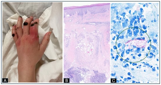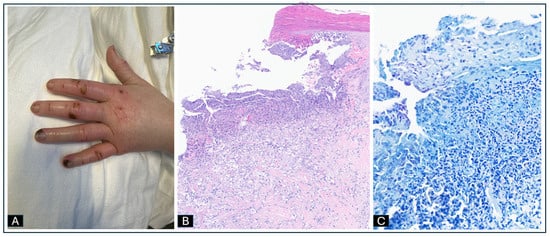 Her hand pain worsened, and she was admitted 1 week later to the hospital for further evaluation. Her admission vital signs were blood pressure of 152/78 mmHg, heart rate of 96 bpm, respiratory rate of 19 rpm, and temperature of 36.7 °C. Her laboratory workup is summarized in Table 1. Her physical exam was notable for multiple eschars in the left-hand fingers and dorsum of the left hand, with surrounding erythema and swelling predominant in the left index finger (Figure 2A). MRI of her left hand showed scattered subcutaneous edema of the hand and fingers and early osteomyelitis of the index finger proximal phalanx base. She was initiated on IV vancomycin (renally dosed) and IV ertapenem 1 g daily with a plan to treat for 6 weeks. A skin biopsy of one of the necrotic lesions showed a crusted superficial ulcer with focal occlusive vasculopathy, negative for leukocytoclastic vasculitis (Figure 2B), and negative AFB stain (Figure 2C), gram stain, bacterial and mycobacterial cultures.