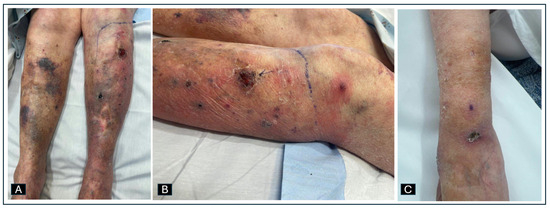 (A) Front view of left leg with scattered violaceous-dusky, maculopapular rash. (B) Lateral view of left leg with same described rash and large chronic ulcerated necrotic plaque. (C) Right upper extremity with scattered plaques with a violaceous center.