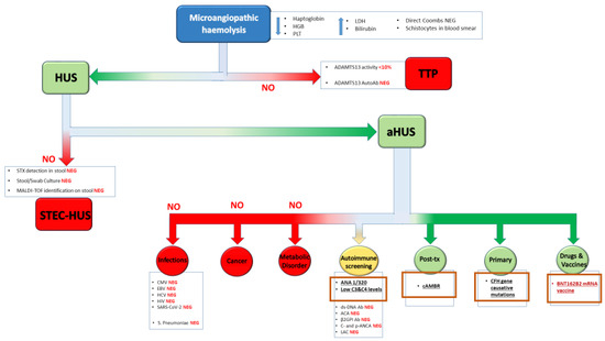 Diagnostic workup. The red “NO” indicates the excluded diagnostic hypotheses. “HGB”: hemoglobin; “PLT”: Platelets; “LDH”: Lactate DeHydrogenase; “Ab”: Antibody; “NEG”: Negative; “TTP”: Thrombotic Thrombocytopenic purpura; “HUS”: Hemolytic Uremic Syndrome; “STX”: Shiga-like ToXin; “STEC-HUS”: Shiga Toxin-producing Escherichia Coli-associated Hemolytic Uremic Syndrome; “aHUS”: atypical Hemolytic Uremic Syndrome; “CMV”: Cytomegalovirus; “HCV”: Hepatitis C Virus; “EBV”: Epstein-Bar Virus; “HIV”: Human Immunodeficiency Virus; “SARS-CoV-2”: Severe Acute Respiratory Syndrome CoronaVirus-2; “S. Pneumoniae”: Streptococcus Pneumoniae; “ANA”: AntiNuclear Antibody; “ds-DNA Ab”: double stranded DNA Antibody; “ACA”: Anti-Cardiolipin Antibody; “β2GPI Ab”: β2 Glycoprotein I Antibody; “c- and p-ANCA”: cytoplasmic and perinuclear AntiNeutrophil Cytoplasmic Antibody; “LAC”: Lupus AntiCoagulant; “cAMBR”: chronic active Antibody-Mediated Rejection.