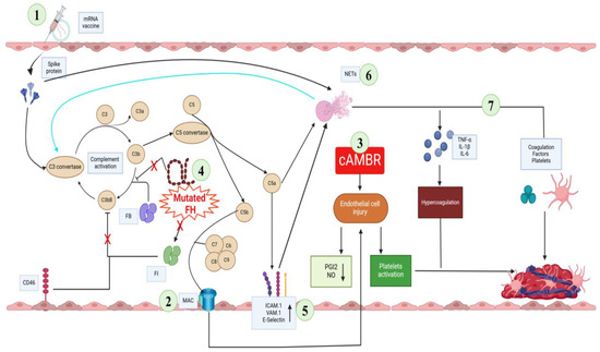 Molecular pathways of aHUS in our case. (1) The mRNA vaccine activates the complement system, leading to the formation of the (2) Membrane Attack Complex (MAC) which causes endothelial cell injury, a decrease in antithrombotic substances (PGI2 and NO), and platelet activation. (3) Chronic vascular rejection (cABMR) makes the endothelium more susceptible to thrombus formation. (4) The mutation of CFH, a key protein in the regulation of the complement system, causes an overproduction of the anaphylatoxin C5a. C5a stimulates both (5) the expression of adhesion molecules on endothelial cells and (6) the activation of neutrophils with the release of NETs. (7) NETs enhance the state of hypercoagulation indirectly through the release of inflammatory cytokines and direct binding to coagulation factors and platelets. Created with BioRender.com.