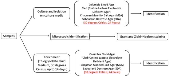 The samples that arrived at the in-hospital laboratory were split into three groups: one used for microscopic identification with Gram staining, one used for culture and isolation on four different culture media, and the third one used for enrichment for up to 14 days (Figure 1).