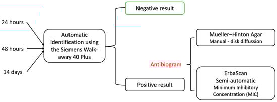Schematic representation of the microbiological identification and results. An automatic identification of pathogens is used at 24 h, 48 h, and 14 days, followed by the antibiogram done manually with disk diffusion or semi-automatic with minimum inhibitory concentration, according to the latest recommendations by the European Committee on Antimicrobial Susceptibility Testing (EUCAST).