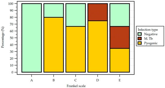 There were no significant differences between the urban or rural area background and the type of pathological agent that determined the disease. Regarding the neurological impairment, the Frankel classification scale was used by the spinal specialist who evaluated all patients at admission, and the results were as follows: 79 patients were Frankel E, 5 patients were Frankel D, 3 patients were Frankel C, 5 patients were Frankel B and 1 patient was Frankel A, without any significant differences between the neurological impairment and the etiology of infection (Figure 3).
