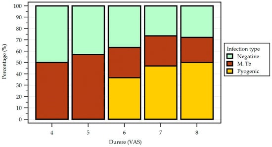Spondylodiscitis is an infectious disease with a massive impact on the healthcare system, affecting the socio-economical life of a patient []. As patients can be young and active individuals, early diagnosis and thorough adequate treatment are essential. The symptoms of spondylodiscitis can be non-specific, however, back pain of the affected region is the first one to appear, followed by neurological impairment at various periods of time depending on the first on-set of symptoms [,]. This can cause a delay in diagnosis, with pain increasing over time. In our study, a link between the levels of pain on the VAS scale at admission in the hospital and the etiology of the spondylodiscitis has been established, with patients that had pyogenic spondylodiscitis with positive cultures having higher levels of back pain than those with tuberculous spondylodiscitis and those with negative cultures.