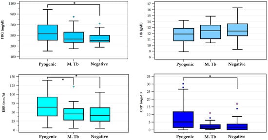 ESR, FBG, and Hb levels between the study groups. ESR = erythrocyte sedimentation rate, FBG = fibrinogen, Hb = hemoglobin. Significant differences (p < 0.05) between groups are marked with *. Circles represent outside values (beyond the lower/upper quartile ± 1.5 times the interquartile range); squares represent far out values (beyond the lower/upper quartile ± 3 times the interquartile range). Note: three extreme outliers were excluded from the CRP graph.