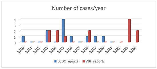 During the 15-year period studied (January 2010–October 2024), we encountered a number of 13 cases diagnosed with typhoid fever and hospitalised in our centre. We did not find any case with a diagnosis of paratyphoid fever during this period. We compared the number of cases per year to the data reported by Romania to the ECDC, to the last available report in 2021 [13] and to the number of cases reported by our centre, the VBH, with a diagnosis of typhoid fever, which we show in Figure 1.