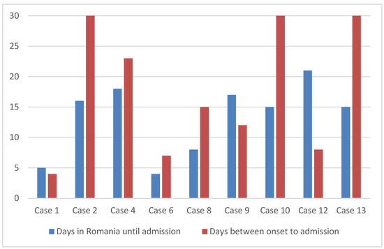 From the epidemiological investigations, we noted that none of the patients had been vaccinated against typhoid fever. In addition, none of the patients had received a prior travel medicine consultation. The possible consequence of this finding was a delay in presenting to the doctor after the onset of symptoms. This delay is shown in Figure 3, where we highlight the difference in the number of days between the repatriation and onset hospitalisations for the nine cases diagnosed in the VBH.