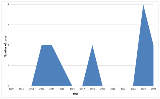Figure 4 depicts the number of cases admitted to our hospital by year. In the COVID-19 pandemic years, there were no cases registered. In the last two years, six more cases have been described.