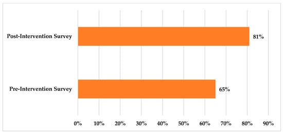 When comparing the correct responses to the seven knowledge-based true or false statements included in both the pre-and post-intervention surveys, we saw a significant shift in vaccine literacy from the baseline. Notably, awareness that the influenza vaccine enhanced the immune response changed from 75% before the intervention to 94% afterward (p-value < 0.05). Understanding that stronger influenza vaccines are recommended for older adults rose from 47% to 87% (p-value < 0.05). Additionally, fewer participants believed the vaccine caused influenza, where correct responses increased from 58% to 76% (p-value < 0.05). Knowledge also improved from the baseline concerning the statement that the flu vaccine can still reduce the severity and duration of influenza symptoms, even if it does not cover all types of circulating viruses; the correct responses changed from 84% to 96% (p-value < 0.05). Regarding perceptions about effectiveness, the percentage of respondents that indicated that this year’s flu vaccine is less effective than in most years changed from 76% in the pre-intervention survey to 88% in the post-intervention survey (p-value < 0.05). Furthermore, awareness that the flu vaccine is recommended for everyone, regardless of age or health status, improved from 57% in the baseline survey to 87% (p-value < 0.05) in the post-intervention survey. While we did note a shift in the number of correct responses to the statement “The flu vaccine is unnecessary if you haven’t had the flu in several years” (82% vs. 91%, in the pre-and post-intervention surveys, respectively). This shift was not statistically significant, at a p-value of 0.06 (p > 0.05). A bar graph comparison of the percentages of individuals who responded correctly to the seven knowledge-based true or false statements is shown in Figure 1. The counts and percentages of individuals who responded correctly to the seven knowledge-based true or false statements in the pre-and post-intervention surveys are shown in Table S1.